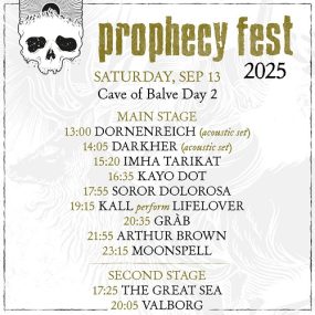 Prophecy Fest @ Balver Höhle, Balve, Duitsland. Op de tweede complete dag van Prophecy Fest krijgen we nog elf bands te horen en te zien. Opnieuw staat het thema “donkere klankkleur” hier centraal, maar dat is een logisch vervolg als je iet of wat het label Prophecy Productions volgt. *Foto’s: Dornenreich* Het Oostenrijkse Dornenreich mag